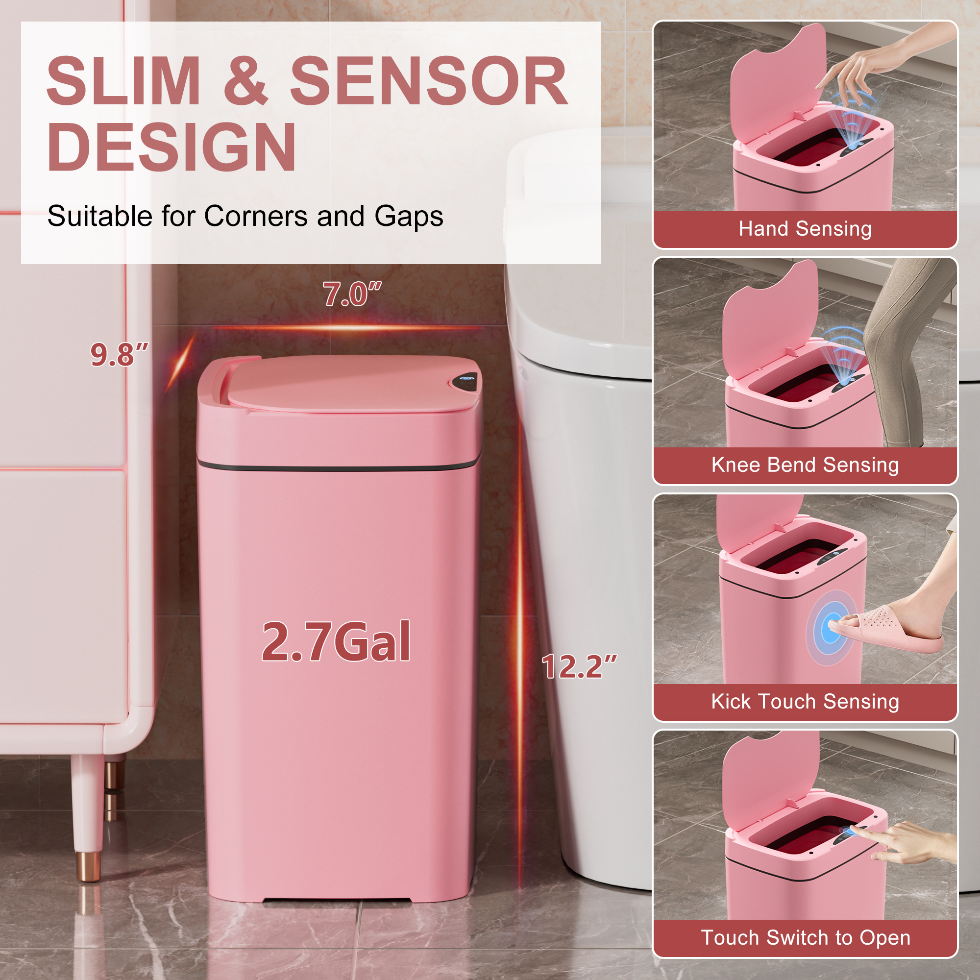 【SPACE SAVING & EASY TO USE】 The 2.7 Gal Slim Bathroom Trash Can fits perfectly in narrow spaces. Measuring 7.0″ W, 9.8″ W, 12.2″ H maximizes indoor space utilization. It’s suitable for use in bathrooms, kitchens, bedrooms, living rooms, offices, dorms, and more.