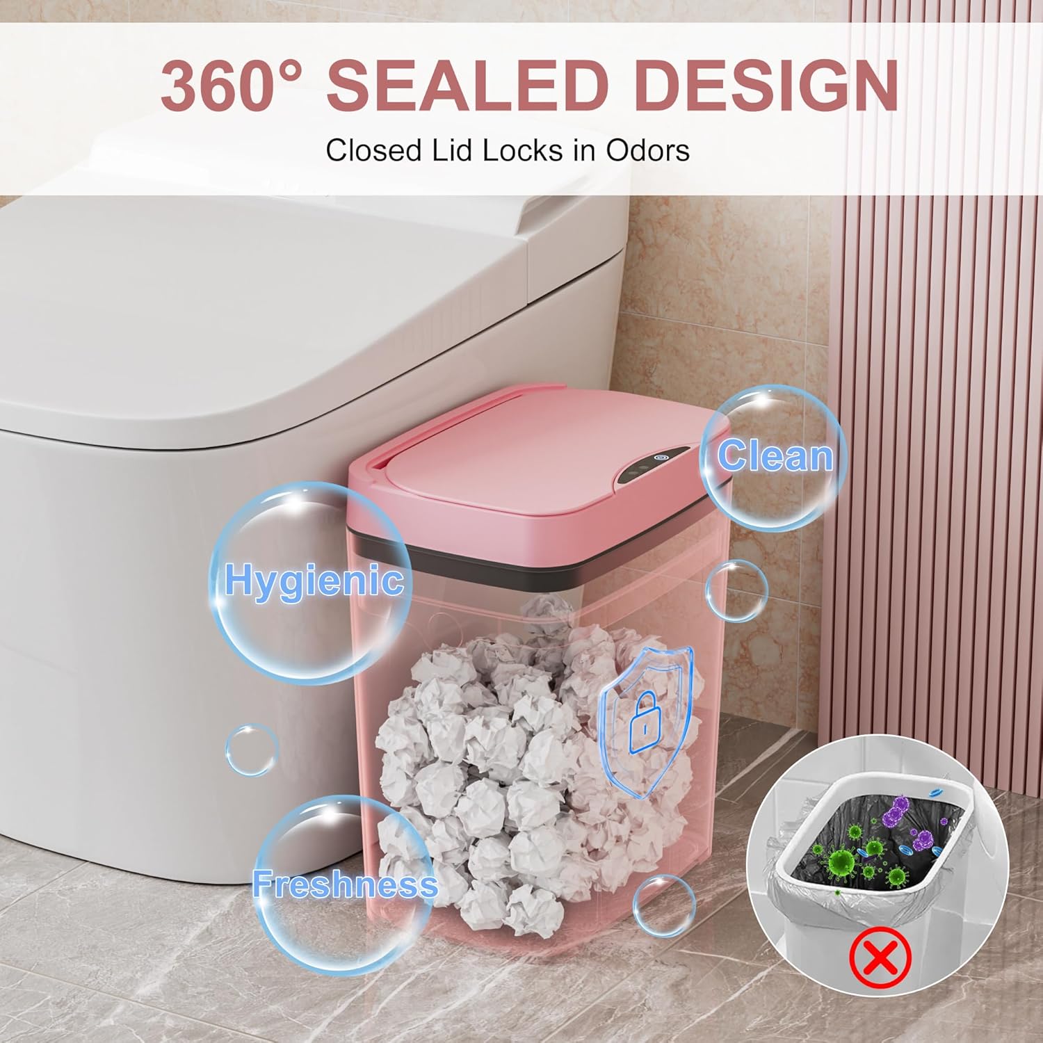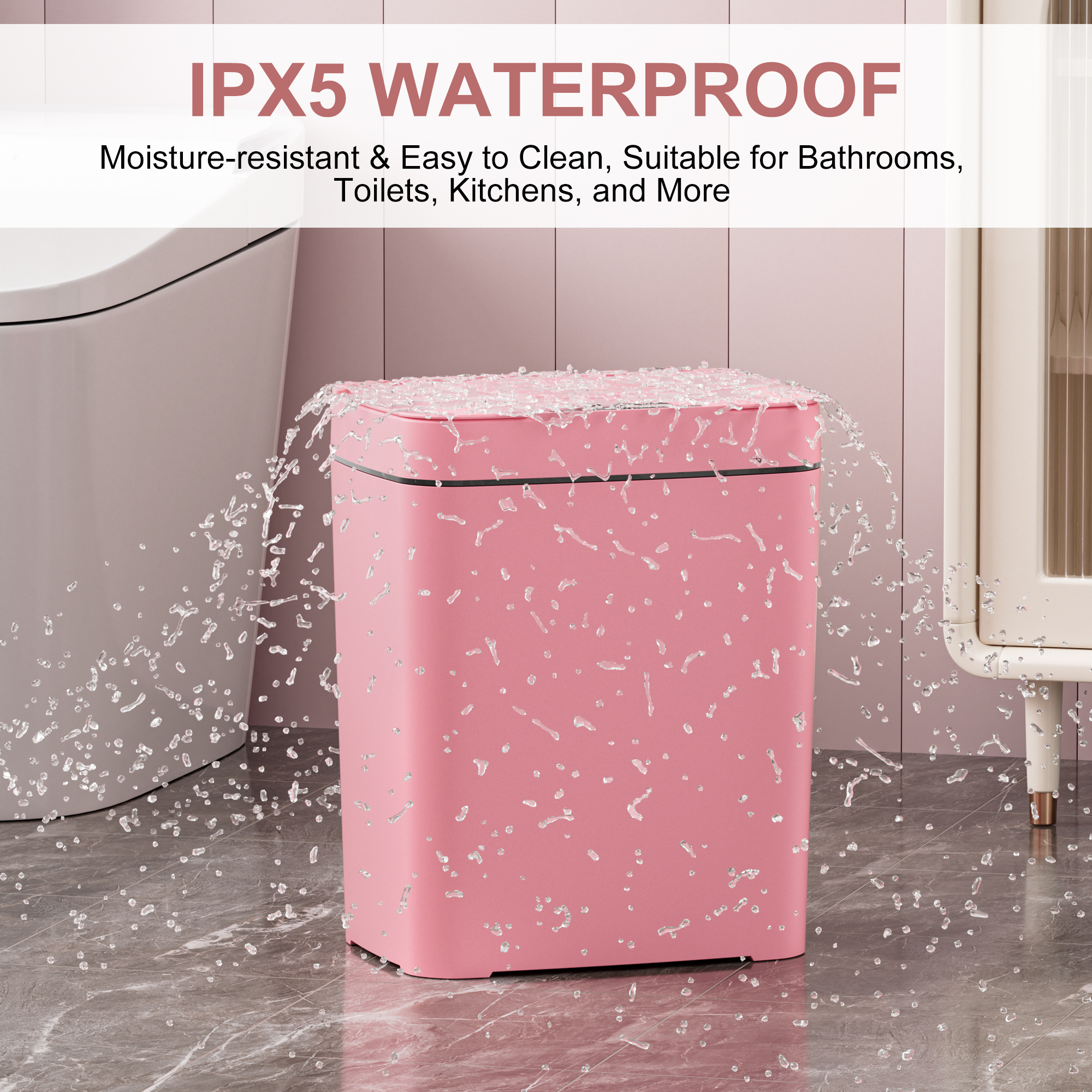 【WATERPROOF & MOISTURE-PROOF】 Smart Motion Sensor Garbage Bin with lid is made of high-quality PP material, making it durable and waterproof. With an IPX5 waterproof rating, it is suitable for bathroom splashes. The Garbage Can prevents water from entering, making it easier to clean.
