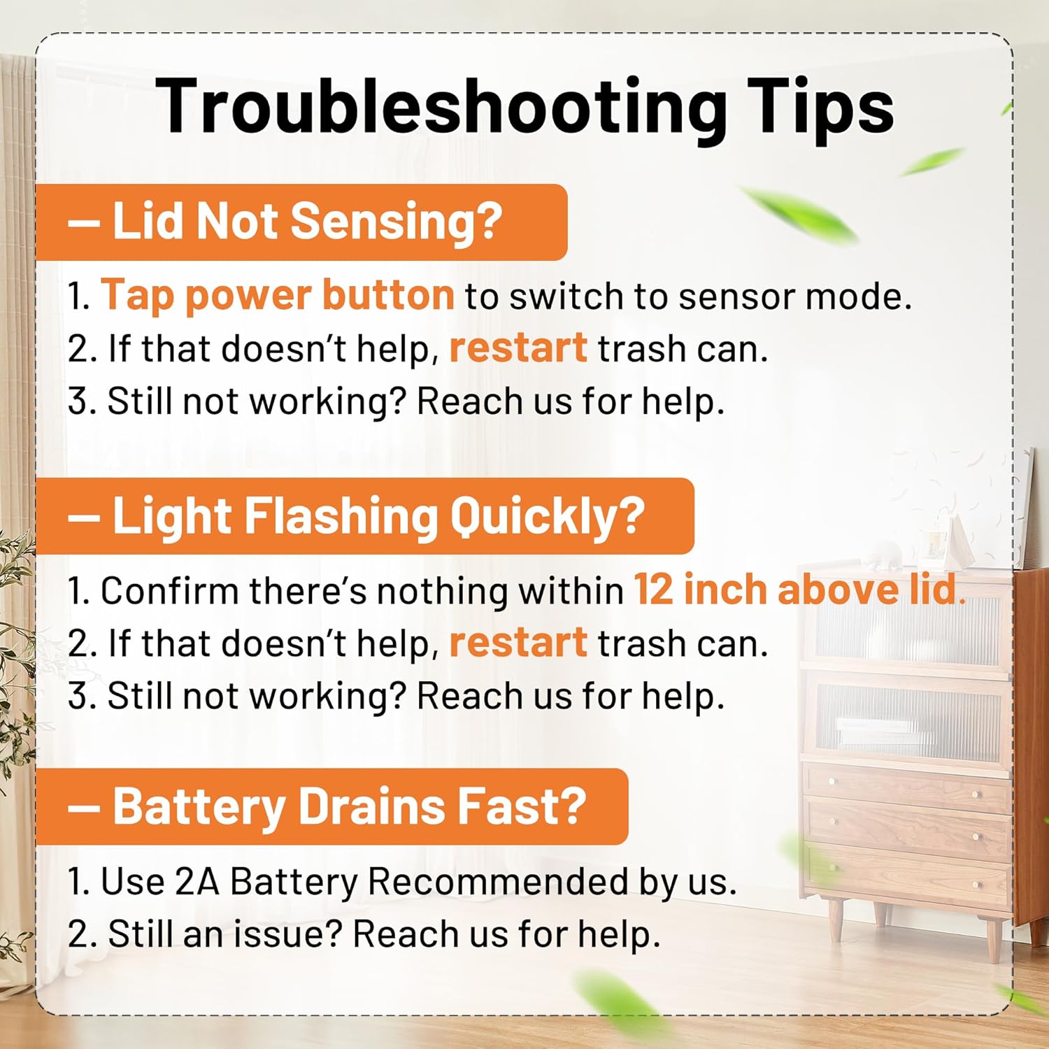 After the AA batteries are installed, the trash can is turned off.Press and hold the for power button to turn on the trash can.If the indicator light flashes red, the battery is low; please replace the batteries.